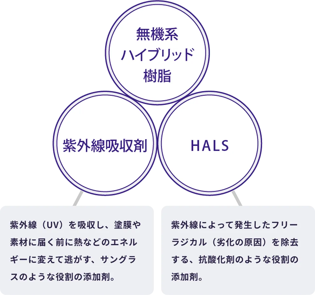 塗膜の劣化原因とされる高い強度の紫外線をカットする紫外線吸収剤と、光安定剤(HALS)を配合した無機系ハイブリッド樹脂の独自開発を行い、フッ素樹脂塗料を超える耐候性を実現しました。